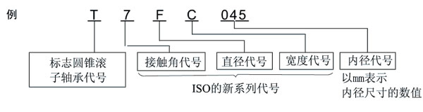 ISO355所規(guī)定的公制系列的圓錐滾子軸承中, 有不依據(jù)以往所使用的3xx尺寸系列的新尺寸。其中一部分記載于尺寸表。外圈寬度、外圈滾道的小端面直徑及接觸角與ISO的規(guī)定一致、內(nèi)圈組件和外圈均具有*際互換性。其型號不同于以往的公制系列,構(gòu)成如下。